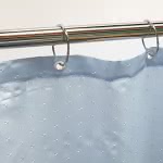Занавеска из 100% полиэстера для ванны с 12 люверсами под кольца. Цвет: небесно-голубой с мелкой вышивкой. Вышивка видна только вблизи (см.фото крыпным планом), на расстоянии эти элементы практически не видны и штора становится однотонной. Штора обработана специальной пропиткой, отталкивающей воду. Внизу по всей длине вшит шнур-утяжелитель.
